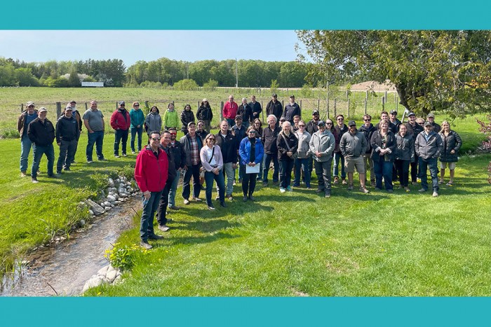 Close to 50 drainage engineers and municipal drainage superintendents, from southwestern Ontario, toured municipal drains in Huron and Lambton counties on Wednesday, May 17, 2023 to learn about rural green infrastructure and best practices for municipal drains. Attendees visited a number of sites with examples of innovative practices.